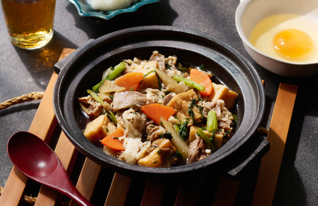 やわらかい牛肉とほのかな苦みの春菊を、醤油と黒糖の甘辛い割下で仕上げたすき焼き風の一皿。厚揚げやシャキシャキのごぼうにも牛の旨みと濃厚な味わいが広がり、ご飯がすすむご褒美メニュー。