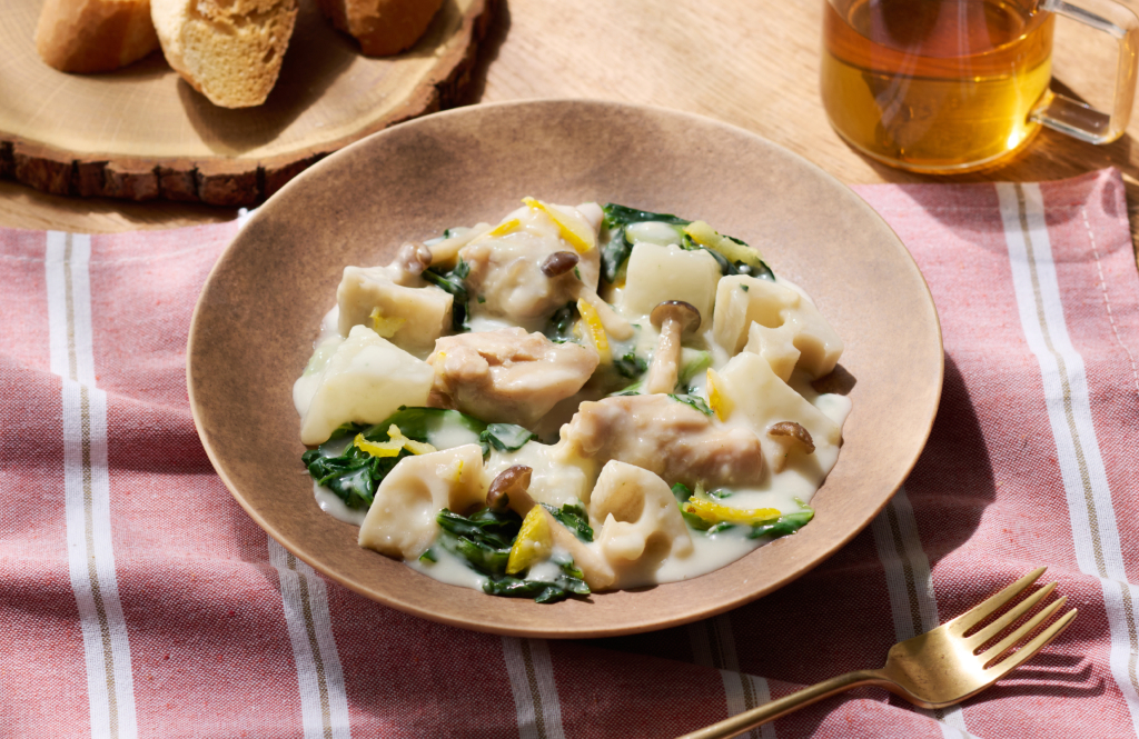 旨みのある鶏もも肉に、甘くとろけるカブやシャキッとした小松菜、レンコン、しめじを合わせ、塩麹と昆布でまろやかに仕上げた和風クリーム煮風です。ひと口食べると、ゆずの香りがふわっと広がる贅沢な一品。