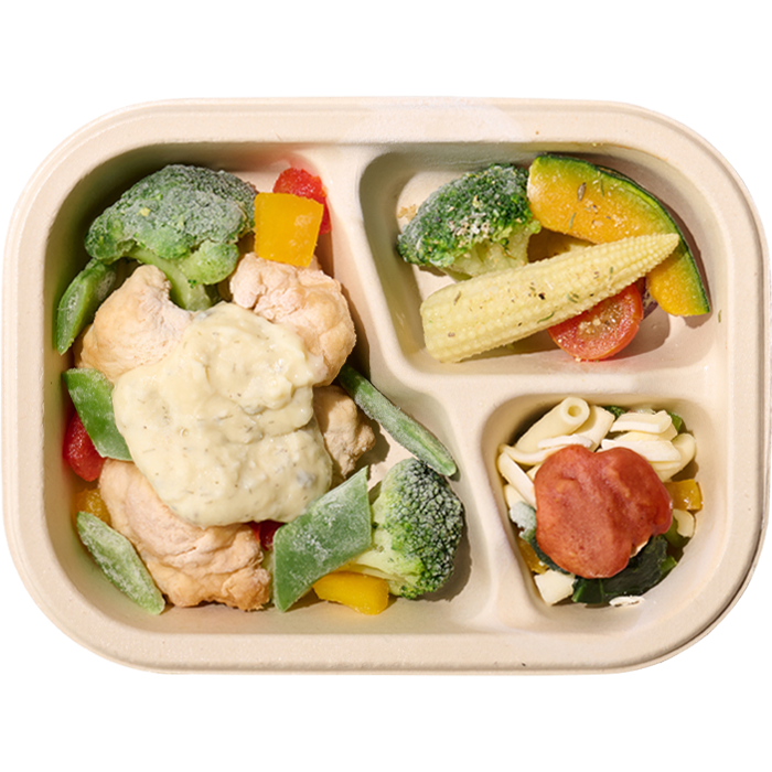 【ハーブ香る白身魚の贅沢タルタルソース】鱈のフリット(すけそうだら(国産)、衣(でん粉、小麦粉、植物油脂、砂糖、食塩)、揚げ油(大豆油))(ベトナム製造)、ブロッコリー、モロッコいんげん、マヨネーズ、赤黄ピーマン、牛乳、スイートレリッシュ、卵黄粉末、チキンコンソメ、食塩、ガーリックパウダー、ジンジャーパウダー、黒こしょう、ディルウィード【チーズトマトマカロニ】マカロニ、ほうれん草、トマトピューレー、黄ピーマン、トマトペースト、ミックスチーズ、ガーリックオイル、白ワイン、すりおろしにんにく、チキンエキス、野菜ブイヨンベース、ポークエキス、しょうゆ、セロリソルト【温野菜サラダ】ブロッコリー、ヤングコーン、さつまいも、かぼちゃ、チェリートマト、ハーブソルト/増粘剤(加工でん粉、増粘多糖類)、加工でん粉、トレハロース、調味料(アミノ酸)、酸味料、アルギン酸エステル、乳化剤、香辛料抽出物、(一部に小麦・卵・乳成分・大豆・鶏肉・豚肉・ゼラチンを含む)
