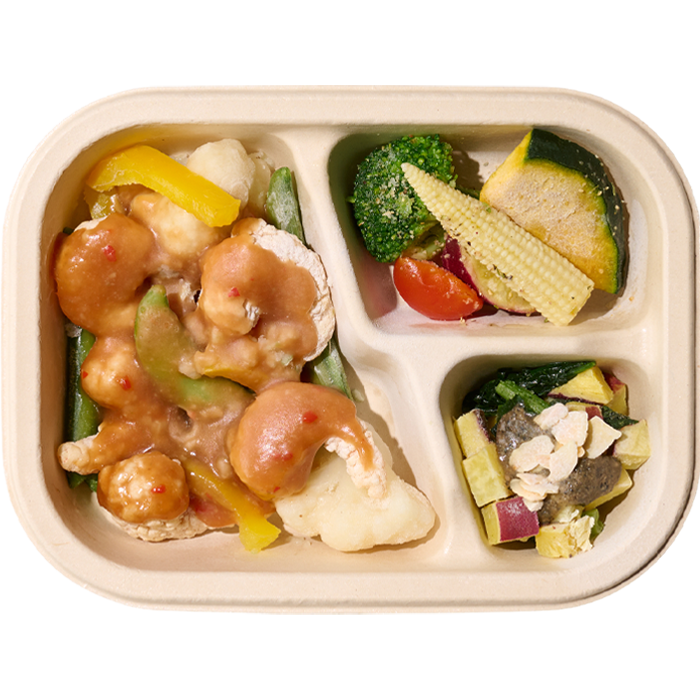 【彩り野菜と甘辛ソースの特製エビチリ】エビフリット(えび、食塩、衣(でん粉、小麦粉、食塩、ぶどう糖、植物油脂)、揚げ油(パーム油))(ベトナム製造又はタイ製造)、カリフラワー、スナップえんどう、黄ピーマン、トマトケチャップ、スイートチリソース、白ねぎ、ねぎペースト、しょうゆ、すりおろし生姜、すりおろしにんにく【さつまいもの黒胡麻ナッツ】さつまいも、ほうれん草、アーモンド、しょうゆ、黒ごま、ごま油、米酢、カシューナッツペースト、てんさい糖、鶏ガラスープ顆粒【温野菜サラダ】ブロッコリー、ヤングコーン、さつまいも、かぼちゃ、チェリートマト、ハーブソルト/加工でん粉、増粘剤(加工でん粉、増粘多糖類)、調味料(アミノ酸)、pH調整剤、カラメル色素、乳化剤、(一部にえび・小麦・乳成分・アーモンド・カシューナッツ・ごま・大豆・鶏肉を含む)